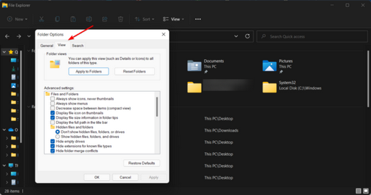 进入“文件夹选项”菜单后,导航到“查看”选项卡。
