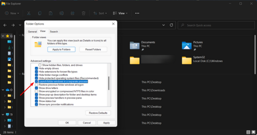 现在,向下滚动选项并 在单独的进程中选中与 Launch 文件夹选项关联的框。
