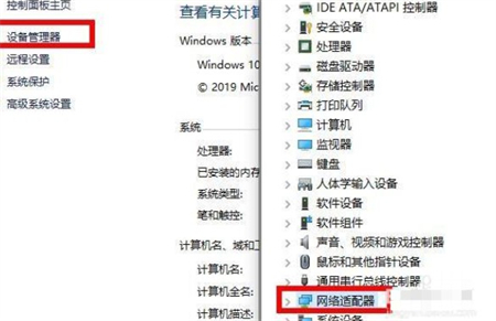 如图所示:右击此电脑,选择属性,然后点击“设备管理器”并选择下方的“网络适配器”。