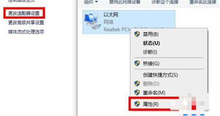 如图所示:然后点击左侧任务栏中的“更改适配器设置”然后右击本地网络选择“属性”。