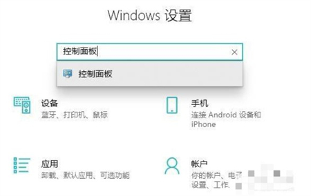 如图所示:点击左下角开始打开设置,在搜索框中输入“控制面板”。