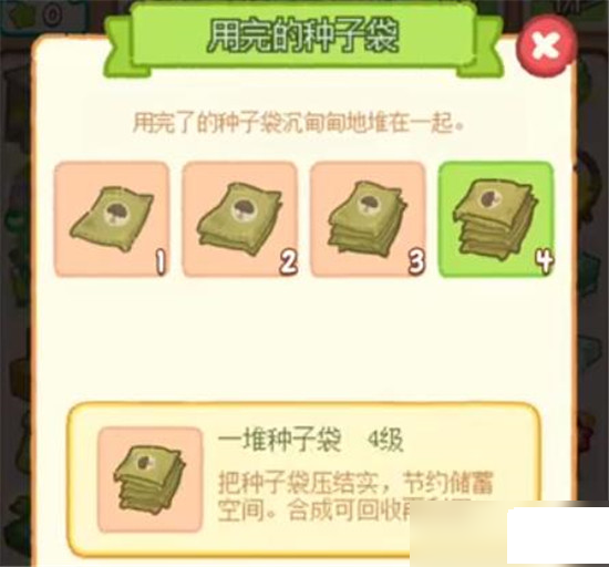 游戏中玩家可以使用两个4级用完的种子袋来合成1个1级布袋玩偶。