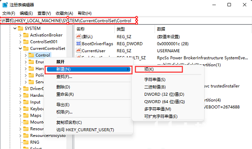 找到并右键点击 Control ,打开的菜单项中,选择新建 - 项,命名为 StorageDevicePolicies ;