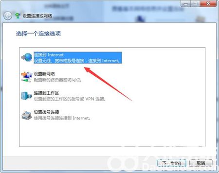 4、进入设置连接或网络窗口,选择第一项“连接到Internet”。