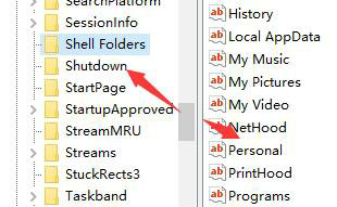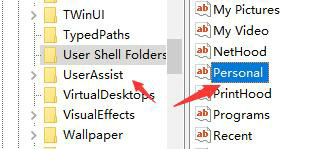 6、接着回到注册表编辑器,用同样的方法打开“user shell folders”下的“personal”文件。