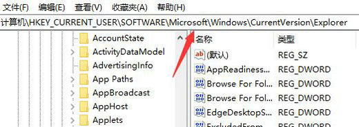 3、然后将“HKEY_CURRENT_USER\Software\Microsoft\Windows\CurrentVersion\Explorer”这个路径复制粘贴进去,如图所示。