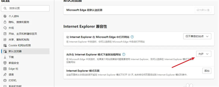 在默认浏览器页面,设置【允许】在Internet explorer模式下重新加载网站。