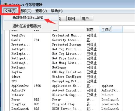 2、在弹出的‘任务管理器’窗口,依次点击打开‘文件’---‘新建任务’。
