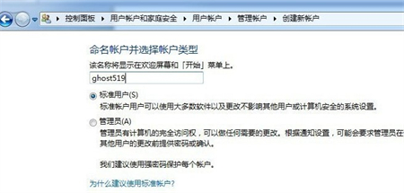 5、输入完新账户用户名后(这里我们输入ghost519),点击:创建账户“即可,这时就回到账号管理窗口,我们可以看到新创建的账号了,如下图: