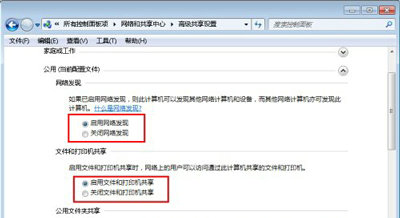 3、再点击“网络和共享中心/更改高级共享设置”,在“家庭或工作(当前配置文件)”中启用“网络发现”和“文件和打印机共享”, 如不需要访问密码,可以关闭“密码保护的共享”。