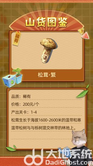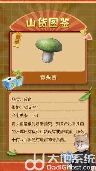 青头菌是很特别的菌类,它一般情况下都是成对出现,如果产出青头菌的区域还有极少山货没有被清理掉,那么十有八九就是有遗留的青头菌。它通常生长在草丛中,与草丛一样的颜色,这伪装难以一眼识别!青头菌在1-4关卡中有产出。