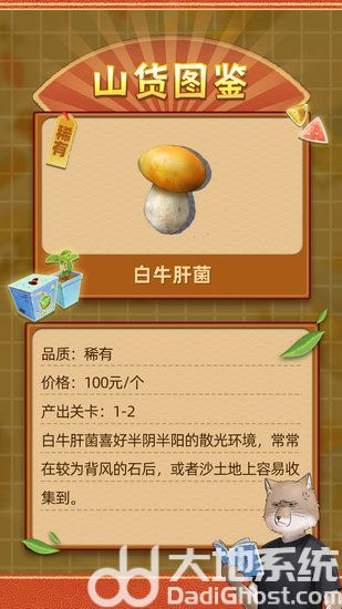 白色的牛肝菌被广大赶山人亲切的称呼为白牛肝菌,它喜好半阴半阳的散光环境,常常在较为背风的石后,或者沙土地上容易收集到。白牛肝菌仅仅在1-2关卡产出,前期确实发展资金的赶山人可以多来几次哟!