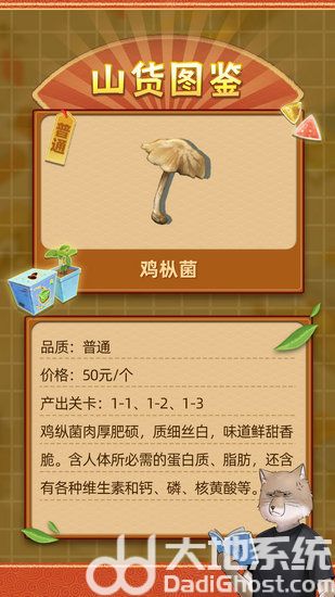 鸡枞菌非常美味,荤素均可造就了混搭的食材风格,可谓是最受欢迎的大众食材之一。它或单生或群生,生长于山地、草坡、田野或林地边,只要熟悉生长环境,寻找到“一窝”也不是难事。鸡枞菌在1-1、1-2、1-3关卡中都有产出。