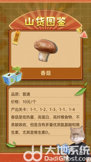 香菇是人们最常食用菌菇,用它炖出来的排骨,美味到怀疑人生。它藏身于树根、草丛、青苔石之间,非常容易被发现。香菇在1-1、1-2、1-3、1-1、1-4关卡中均有产出,是妥妥日常尖货。
