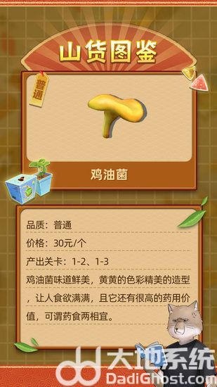鸡油菌味道鲜美,黄黄的色彩精美的造型,让人食欲满满,且它还有很高的药用价值,可谓药食两相宜。它一般生长在林地中,喜好阴暗的环境,在青苔遍地的环境中相对容易被找到。鸡油菌在1-2、1-3关卡中均有产出,价格不菲可以多多收集一些。