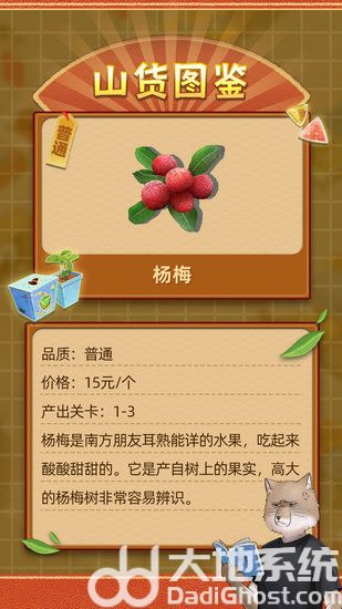 杨梅是南方朋友耳熟能详的水果,吃起来酸酸甜甜的。它是产自树上的果实,高大的杨梅树非常容易辨识,只要拼手速即可大量获得,每次都可收集15-20串,产量非常高。杨梅只有在1-3关卡中有产出。