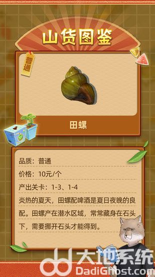 炎热的夏天,田螺配啤酒是夏日夜晚的良配。田螺产在潜水区域,常常藏身在石头下,需要挪开石头才能得到,相对来说有点消耗体力,推荐大家量力而行。田螺在1-3、1-4关卡中均有产出。