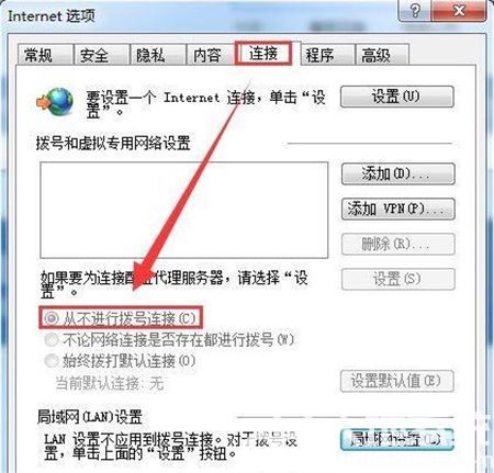 5、返回到Internet选项中,然后再查看一下自己是否设置的有从不进行拨号连接选项。