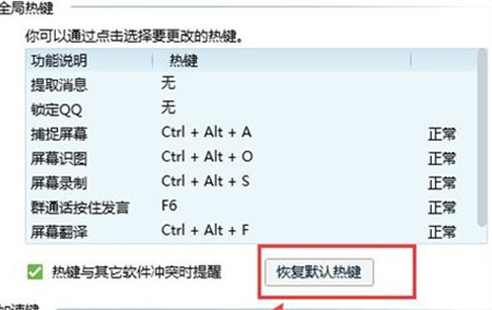 4、进入设置热键页,截图快捷键是空白的话,直接点恢复默认热键,这样就可以按Alt+ctrl+A截图了。
