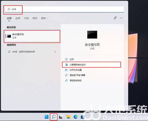 1、首先,按键盘上的 Win + S 组合键,或点击任务栏上的搜索图标,打开的Windows 搜索窗口,顶部搜索框,输入cmd,然后点击以管理员身份运行命令提示符应用。