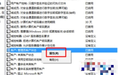 5、鼠标右键单击“账户:管理员状态”,在弹出的快捷菜单中选择“属性”。