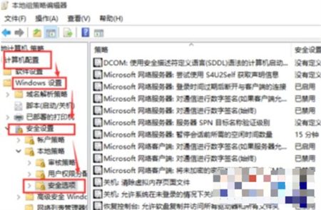 3、依次点击打开“计算机配置”选项,然后再找到“Windows设置”这个选项,再从“Windows设置”找到并打开“安全设置”选项,接着打开“本地策略”最后找到打开“安全选项”即可。