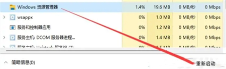 3.任务管理器窗口,选择Windows 资源管理器进程,点击右下角的重新启动,即可重启Windows 资源管理器,这其实是Windows 资源管理器进程explorer.exe结束后,又重新启动的过程。