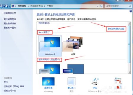 3.还可以看到我的主题下有两大类主题分别是Aero主题(设置该主题按快捷键win+Tab,可以打开3D视觉桌面)和基本和高对比主题。可以点击“联机获取更多主题”。