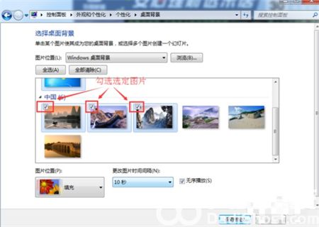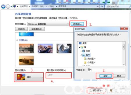 5.或者可以选用本地图片作为背景,点击“浏览”打开,选好之后“确定”。然后可以操作图片位置(建议使用填充),更改图片时间间隔(即是桌面图片多长时间切换一次),都操作完成以后,点击“保存修改”即可。