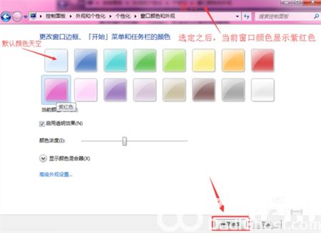 6.还可以设置窗口颜色,返回到个性化窗口,同理下拉窗口栏底部,点击“窗口颜色”,默认的窗口颜色是天空颜色,可以选定颜色看到效果,然后点击“保存修改”即可。