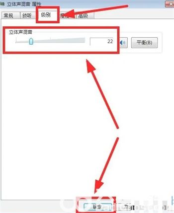 7.进入属性菜单后选择“级别”标签,然后调整好合适的混合音的音量。设置完毕后点击“确定”。