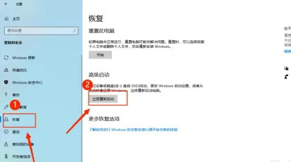 3、在左侧选项中选择恢复,在恢复界面中找到立即重新启动选项即可