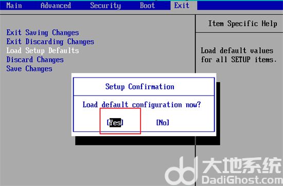 4、接着我们在第三选项上,按回车键,然后选择yes选项即可将bios恢复为默认设置,重启一下就可以了。