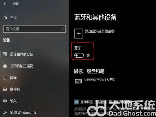5、进入之后在会话框右边部分就出现“蓝牙”的选项,并且下方有一个开关模样的按钮,点击该按钮即打开了win10 的蓝牙设置。