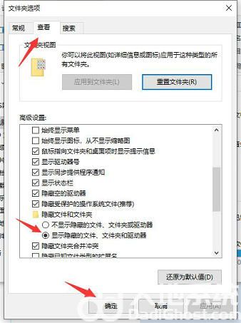 3、进去文件夹选项界面之后点击查看,下滑找到隐藏文件和文件夹,展开后勾选“显示隐藏的文件、文件夹和驱动器”点击确定,这样磁盘的隐藏文件夹就可以全部显示出来了