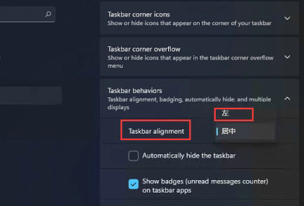 3、选中下方的任务栏设置“taskbar alignment”,将它设置为“左”