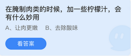 我们每天参加庄园小课堂的答题,都能为小鸡赢得大量的饲料哦,可以看到2022年7月12日准备的题目是“在腌制肉类的时候加一些柠檬汁会有什么妙用”、“在野外看到形似桑葚的小野果可以摘来吃吗”,那么今日答案是什么呢,就是“让肉更嫩”、“有风险,最好不要”。