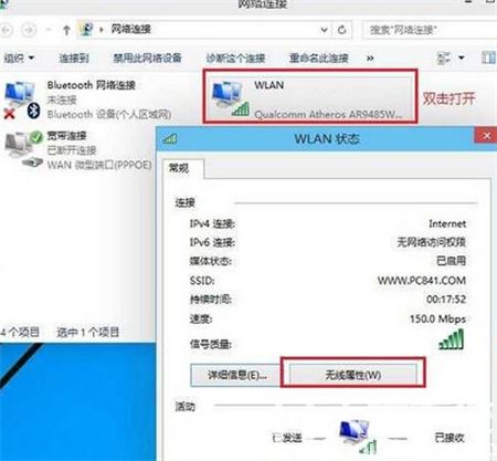 2、双击已经连接的无线网络名称,在弹出窗口中,点击无线属性,如下图所示: