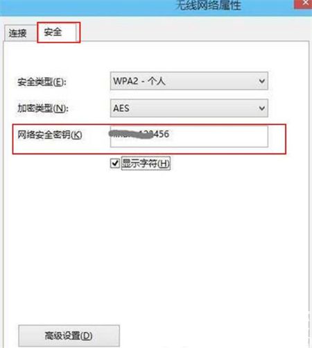3、切换到安全选项,勾选显示字符,就可以看到wifi密码,如下图所示: