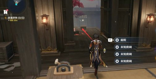 5、第二个御守:沿着通道一直往前走,走到这个看的到外面的栏杆这里在往身后的小通道走去,在上层的尽头有第二个御守和一个宝箱。从正前方的洞口跳下去,将两个御守放入神龛中开启大门,随后根据任务提示,需要找到三个供物来,然后我们穿过通道一路往庭院方向走。