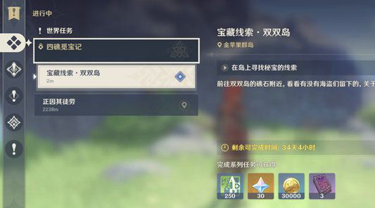 原神手游给玩家们准备了一个四礁觅宝记任务,完成这个任务玩家就能获得一个宝箱,宝箱内存放着原石哦,那么四礁觅宝记宝藏在哪呢,首先我们要前往双双岛东北边的礁石处,触发四礁觅宝记任务,然后在根据线索寻找藏宝图,找到四张藏宝图合起来就能找到最终宝箱的位置啦。