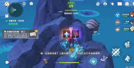 2、清理礁石洞里的丘丘人,再与其对话,它将带你去被迷雾围住的小岛,此地为第一处宝藏线索地点,根据夜鸦船长操作指示,来到小岛,有一个普通宝箱,开启后就能触发限时世界任务《四礁觅宝记》,并获得第一张藏宝图