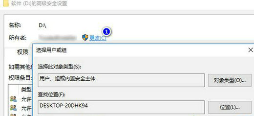 2、点击右下角的“高级”按钮打开“磁盘D:的高级安全设置”窗口,点击“所有者”右侧的“更改”按钮打开“选择用户或组”窗口;