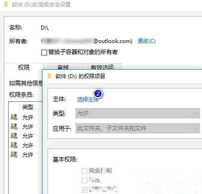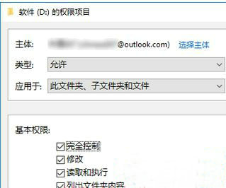 5、你会看到主体已经变成你的帐户了,注意“应用于”要选择“此文件夹、子文件夹和文件”。然后在下面的基本权限框中勾选“完全控制”。确定,回到“磁盘D:的高级安全设置”窗口;
