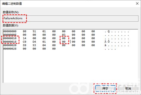 4. 然后再找到“FailureActions”键并双击进行编辑,将“00000010”和“00000018”行中的第五个数值,由原来的“01”改为“00”,再单击“确定”。
