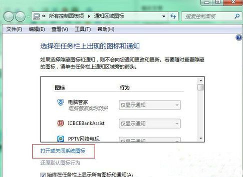 2、在通知区域图标中,点击“打开或关闭系统图标”选项;