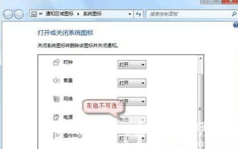 3、在系统图标设置界面,我们找到“电源”设置为“打开”,然后确定保存即可,不过有些用户打开后电源图标打开设置是灰色的无法设置;