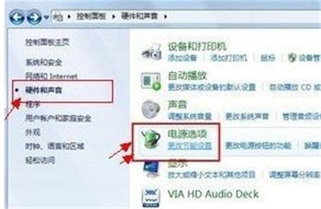 2、点击打开控制面板后,我们再点击左侧的“硬件和声音”,之后再点击右侧的“电源选项”就可以进入Win7电源管理了;