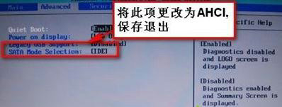 2、重启计算机,进入bios,将IDE模式改为ahci,或者有的机子是SATA MODE---enable。