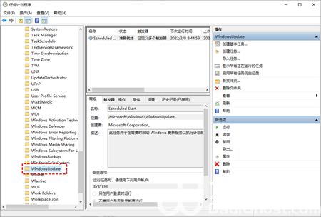 2. 在任务计划程序窗口中,跳转到该路径“任务计划程序库/Microsoft/Windows/WindowsUpdate”。